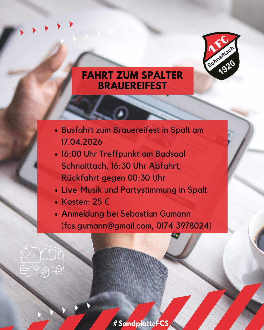 Anmeldung und Platzsicherung über Sebastian Gumann (fcs.gumann@gmail.com, 01743978024).